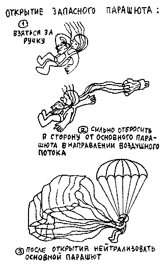 Запасной парашют складывается в очень маленький и легкий пакет. Одна из обычных моделей прикрепляется полосками "велкро" к одной из сторон вашего сиденья. Выступающая петля проходит в пряжку сиденья. Имеется также ручка, которую вы хватаете в случае аварии, тянете и бросаете (с контейнером внутреннего парашюта, прикрепленным к ней) так сильно, как только можете, в направлении, где наименее вероятно пересечение с основным парашютом и где поток воздуха поможет открыться запасному парашюту, — обычно сбоку и сзади вас.