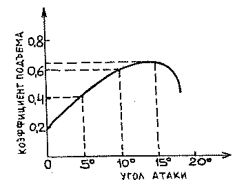 При нулевом угле атаки на вертикальной оси мы видим, что уже существует некоторая подъемная сила. (Кривая начинается со значения около 0,2). На 5 градусах мы получаем по кривой коэффициент подъема 0,4. Подъемная сила крыла удвоилась! При 10 градусах коэффициент равен 0,6, а при 15 — чуть больше, но кривая выравнивается, мы не получаем большой подъемной силы. Где-то между 15 и 20 градусами она полностью падает; больше нет подъемной силы, и крыло падает.