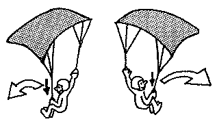 Когда мы тянем за ручку управления, мы опускаем хвостовую кромку, увеличивая угол атаки, а с ним — подъемную силу и силу сопротивления. Если тянуть левую ручку управления, то мы увеличим сопротивление этой стороны купола, и наш парашют повернет налево. Если тянуть правую ручку, мы повернем направо. В этом, собственно, и вся премудрость управления парашютом, и это сравнительно просто.