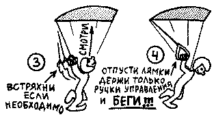 – Минуточку, — скажете вы. — Мы научены тому, что наш парашют может лететь со скоростью от 20 до 40 км/ч. Признано, что при 20 км/ч, когда ручки управления находятся на уровне талии или ниже, он должен схлопнуться до полной потери скорости. Но если руки все время подняты, как вы нас просите, эта штука должна взлететь со своей максимальной скоростью. Вы что, действительно, ждете того, что мы будем бежать так быстро вниз по холму, испытывая силу сопротивления, тянущую назад, и с подошвами, скользящими по траве или песку?