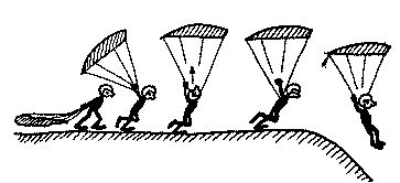Это совсем просто: не верьте тому моменту, когда парашют поднимает вас вверх при повышении скорости бега. Приготовьтесь внутренне к тому, что вам придется бежать весь путь вниз к подножию холма. Пусть для вас будет полной неожиданностью вдруг оказаться над землей, но и тогда не верьте этому, продолжайте бежать в воздухе некоторое время, как бы ожидая падения, что может случиться и случается.