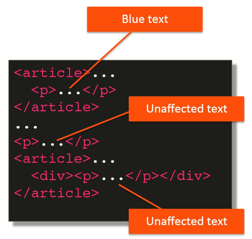 В этом случае мы выделяем каждый элемент p, который находится внутри элемента article на любом уровне, что означает, что даже если это не прямой дочерний элемент, даже если он глубоко внутри, до тех пор, пока один из его родителей является элементом article, это правило будет применяться.
