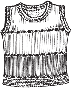Выполнить плечевые и боковые швы. По краю горловины набрать петли и вязать круговыми рядами планку.