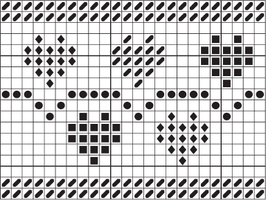 Для спинки набрать на спицы основной нитью 94 петли и вязать следующим образом: 2 см лицевой гладью, 1 ажурный ряд (=* 1 накид, 2 петли провязать вместе лицевой*, повторять от * до * до конца ряда). Продолжить работу лицевой гладью, через 5 см от ажурного ряда выполнить жаккардовый узор из сердечек по схеме (рис. 47).