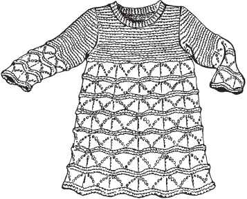 На спицы набрать 94 петли и вязать круговыми рядами, отметив контрастной нитью начало ряда. Вязать резинкой 1 х 1 20 рядов. В 21-м ряду количество петель удвоить, для чего после каждой петли сделать накид. Работу продолжить лицевой гладью, всего провязать 18 круговых рядов. В 19-м круговом ряду петли распределить следующим образом: 51 лицевая петля, 43 петли снять на вспомогательную нить, дополнительно набрать 8 петель, 51 лицевая петля, 43 петли перебросить на вспомогательную нить, дополнительно набрать 8 петель. Продолжить круговыми рядами. При этом в 4-м круговом ряду прибавить по 1 петле на подмышках изделия. Через 15 см от подмышек прибавить по 1 петле через каждые 12 лицевых петель. Повторить прибавки через каждые 5 см полотна. Вязать основное полотнище юбки до желаемой длины платья. В последнем ряду из каждой лицевой петли вывязать по 2 лицевые петли, в следующем ряду все петли закрыть.