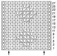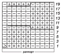 Основной узор: число петель кратно 10 плюс 10 плюс кромочные, со 2-го ряда число петель кратно 11 плюс 10 плюс кромочные. Вяжите по схеме (рис. 23), на которой приведены только лицевые ряды, в изнаночных рядах все петли вяжите по рисунку. Начинайте с кромочной, повторяйте раппорт, заканчивайте петлями после раппорта и кромочной. Повторяйте с 1-го по 20-й ряд, при этом в последнем ряду закройте прибавленные в начале петли.