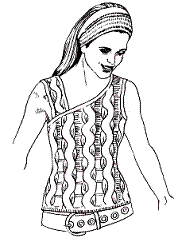 Вам потребуется: 200 г пряжи каштанового цвета, спицы № 3,5, крючок № 2, 70 см ленты из пайеток каштанового цвета, расположенных зигзагообразно в 2 ряда.