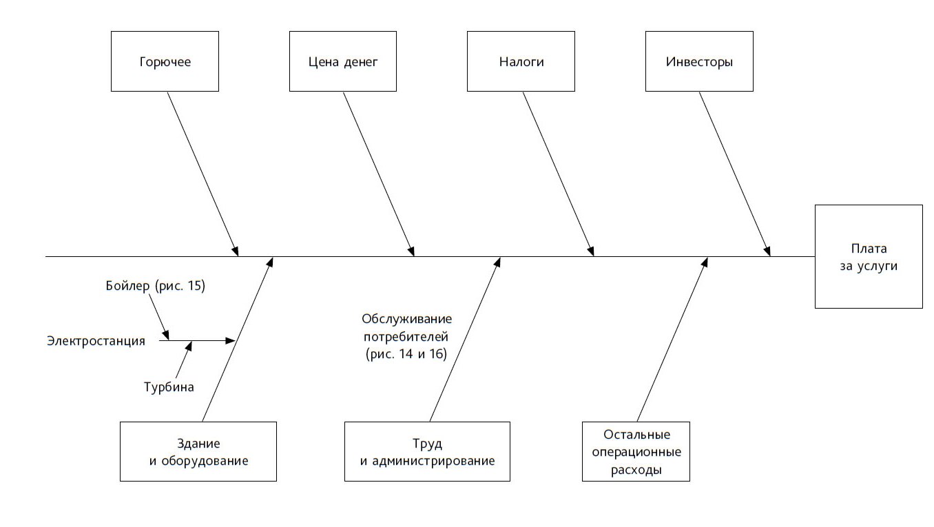 Существует много управляемых факторов работы электростанции, при которых она могла бы вырабатывать и поставлять максимальное количество киловатт-часов, используя минимальное число британских единиц тепла (252 кал.). Их поиск требует изучения многих взаимодействующих систем электростанции. На рис. 14 представлена схема Исикава, где приведены компоненты стоимости услуг для потребителей. А на рис. 15 и 16 представлены контрольные карты, используемые в бойлерной и в отделе обслуживания потребителей.