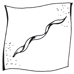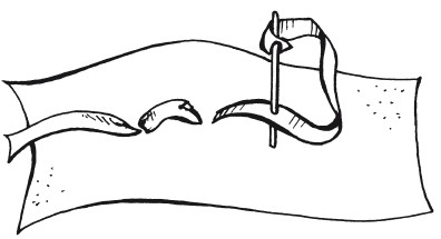 Перекрученный вытянутый стежокобычно применяют при вышивании абстрактных рисунков или в качестве стебельков цветов. Иголку вытягивают на лицевую сторону, отмеряют нужную длину и перекручивают вправленную в нее ленту. Затем вытаскивают иголку на изнаночную сторону, ленту при этом сильно не затягивают (рис. 24).