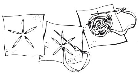 Шов «петельки по кругу»используют для создания объемных цветов, причем выполнить его очень просто. Итак, иголку с лентой вытягивают на лицевую сторону в центре цветка и вновь прокалывают ткань рядом с точкой начала стежка, формируя петельку. Для придания ей округлости в нее вставляют колышек или карандаш. После чего вытягивают иголку с лентой на лицевую сторону рядом с 1-й петелькой и формируют 2-ю петельку тем же способом. Первую петельку закрепляют булавкой. Затем продолжают двигаться по кругу и вышивают остальные петельки, каждый раз закрепляя их булавками. В конце все булавки вынимают, а в середине выполняют узелок (рис. 23). Чтобы получить очень пышный цветок, используют широкую ленту.