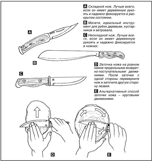 Нож – крайне полезная вещь в пиковой ситуации. Его можно использовать для разных целей: свежевания животных, разделки фруктов, овощей, рубки деревьев. Всегда содержите нож в чистоте, регулярно проверяйте заточку, надежно крепите его в походном положении. Существует огромное количество разновидностей ножей (см. рис. 2), но лучше всего иметь нож с одиночным лезвием и деревянной рукоятью. НИКОГДА НЕ БРОСАЙТЕ НОЖ В ДЕРЕВЬЯ ИЛИ В ЗЕМЛЮ – ВЫ МОЖЕТЕ СЛОМАТЬ ИЛИ ПОТЕРЯТЬ ЕГО!