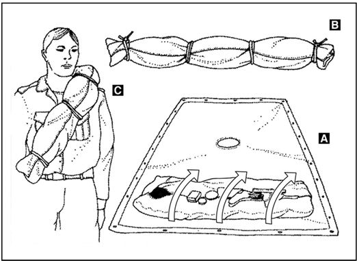 Скатка (рис. 4). Этот импровизированный рюкзак позволяет с максимальным комфортом переносить незначительные грузы на большие расстояния. Скатка делается так: квадратный кусок материи 1,5 на 1,5 м расстилается на земле (А), на его краю в линию размещается груз, а затем ткань скатывается от груза к противоположному краю. Концы свертка связываются бечевой, кроме этого, необходимо обвязать сверток еще как минимум в двух местах. После этого сверток складывается пополам подковообразно, а его концы скрепляются вместе (С). Получается весьма удобный рюкзак, который в течение долгого пути можно перебрасывать с плеча на плечо.