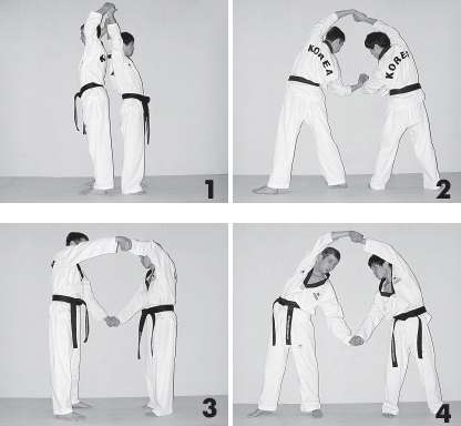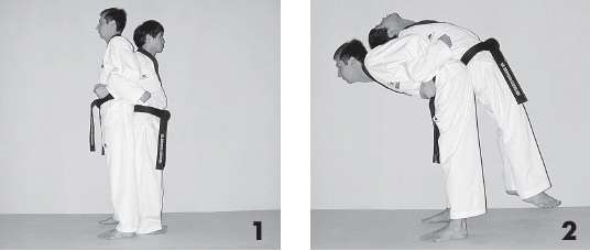 Техника выполнения: выполняется в паре с партнером. Примите исходное положение – стоя спиной друг к другу с партнером, ноги на ширине плеч, поднимите руки вверх и возьмитесь за руки партнера.