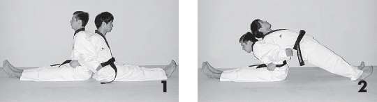 Техника выполнения: выполняется в паре с партнером. Примите исходное положение – сидя на поверхности с партнером спина к спине, ноги прямые, вытянуты перед собой, руки согнуты в локтях и сцеплены с руками партнера в районе локтя.