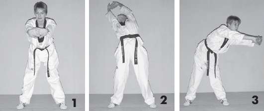 Из исходного положения выполните наклон и коснитесь ладонями поверхности перед собой. Переведите руки назад, потянитесь ими за ноги и коснитесь поверхности пальцами позади себя. Выпрямитесь и выполните наклон назад, прогнувшись в пояснице, руки расположите на пояснице или широко разведите в стороны. Выполняйте три движения на один счет. Вернитесь после наклона назад в исходное положение.