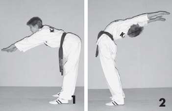 Из исходного положения выведите руки вперед и наклоните туловище вперед под углом 45°. Выпрямитесь, поднимите руки вверх и выполните прогиб в поясничном отделе назад так, чтобы взгляд был направлен на руки. Ноги не сгибайте в коленном суставе. Повторите пружинящие полунаклоны вперед-назад 10 раз.