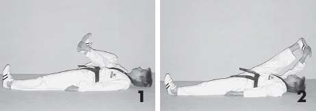 Из исходного положения выпрямите ногу в коленном суставе и рукой потяните на себя. Одна рука держит ногу и оттягивает стопу на себя, вторая фиксирует колено поднятой ноги. Достигнув максимальной для вас точки подъема, задержитесь в этом положении на несколько секунд и выполните упражнение на другую ногу.