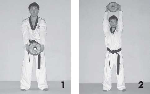 Техника выполнения: упражнение выполняется с использованием отягощения. Примите исходное положение – туловище естественно выпрямлено, ноги вместе, руки согнуты в локтевом суставе на уровне груди и удерживают вес (блин или гриф от штанги).