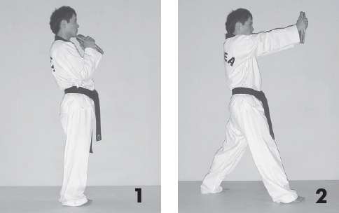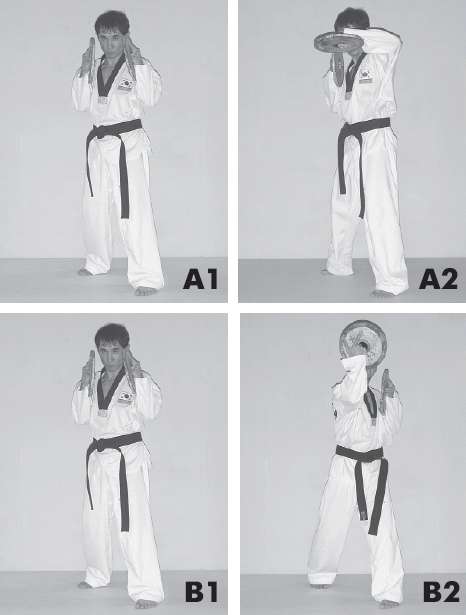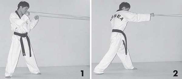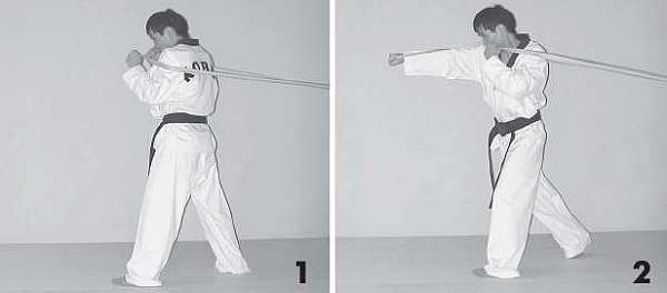 Техника выполнения: упражнение выполняется с использованием резинового жгута. Закрепите резиновый жгут так, как описано в 18-м упражнении. Примите исходное положение – боевая стойка: лицом к закрепленному жгуту.
