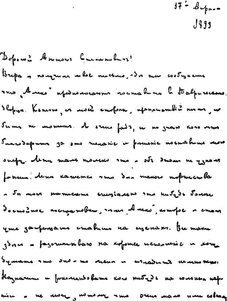 «…Будь добр… сделай мне одолжение… нечего и говорить, конечно, что я заранее одобряю и доволен твоим выбором… В первый момент, как я прочитал твое письмо, мне пришло в голову, что лучше Земфиры — Сионицкой и Шаляпина — Алеко я никого не найду. Но согласятся ли они? Как бы то ни было, но я прошу тебя подождать назначать кого-нибудь на эти роли дней пять, шесть, когда я