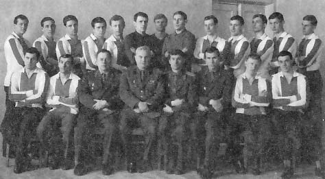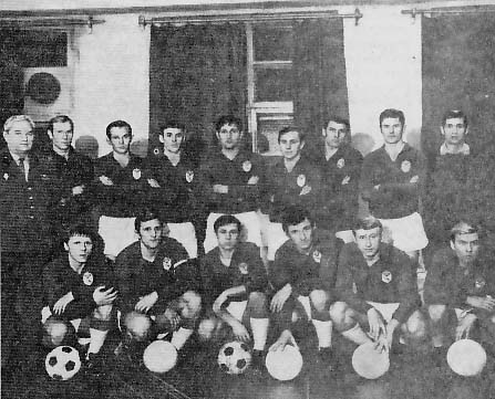 Стоят: старший тренер В. Николаев, Ю, Пшеничников, Н. Долгов, Б. Копейкин, В. Поликарпов, В. Войтенко, В. Астаповский, М. Плахетко, В. Афонин.