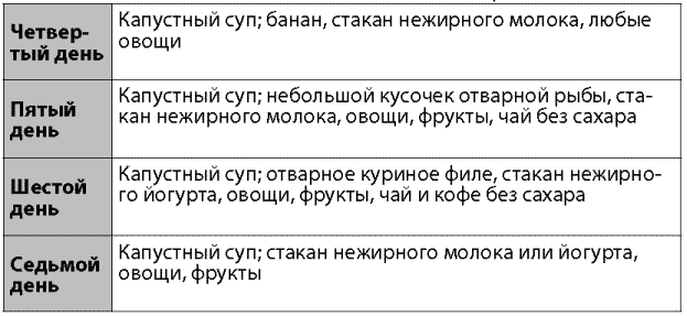 При желании в суп можно добавить 1/2 стакана отварного риса. Данная диета рассчитана на неделю, питание дробное, до 6 раз в день. Во время перекусов можно употреблять любые фрукты, кроме бананов, винограда и инжира. Как источник животного белка рекомендуется использовать нежирные йогурты и молоко. Овощи можно есть любые.