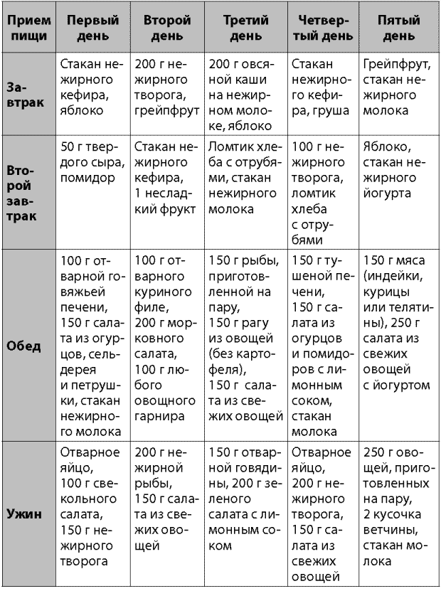 калорийность ежедневного рациона должна быть в пределах 1000–1200 ккал;