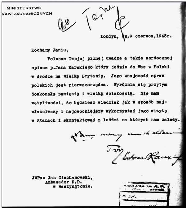 Горячо рекомендую твоему вниманию и поручаю твоему попечению Яна Карского, который направляется к вам из Польши через Великобританию. Он прекрасно осведомлен о положении дел в Польше. Кроме того, это крайне пунктуальный человек, обладающий исключительной памятью. Уверен, что ты сможешь использовать его пребывание в Соединенных Штатах наилучшим образом и связать его с важными для нас лицами.