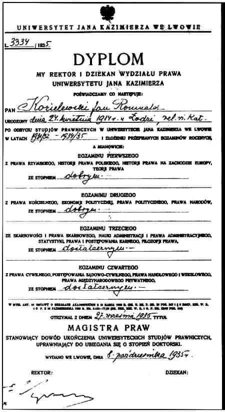 Диплом, выданный Яну Козелевскому 8 октября 1935 г.