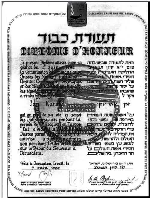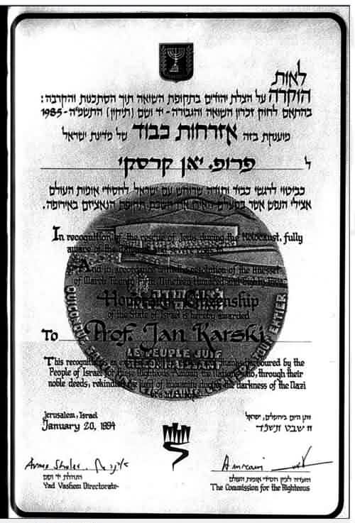 к медали Праведника мира, врученный Яну Карскому 7 июня 1982 г. Институтом Яд Вашем в Израиле после того, как он посадил дерево в Аллее праведников.Диплом почетного гражданина Израиля, врученный Яну Карскому 13 мая 1994 г. в посольстве Израиля в Вашингтоне на устроенной в его честь торжественной церемонии.