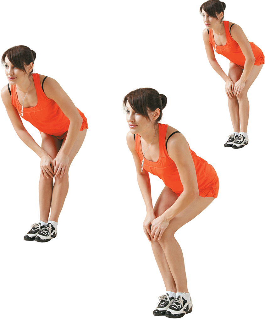 Ступни вместе. Корпус наклонен вниз. Руки заведены «за коленки» и сомкнуты в «замок». Колени – «мягкие». Спина – округлая.