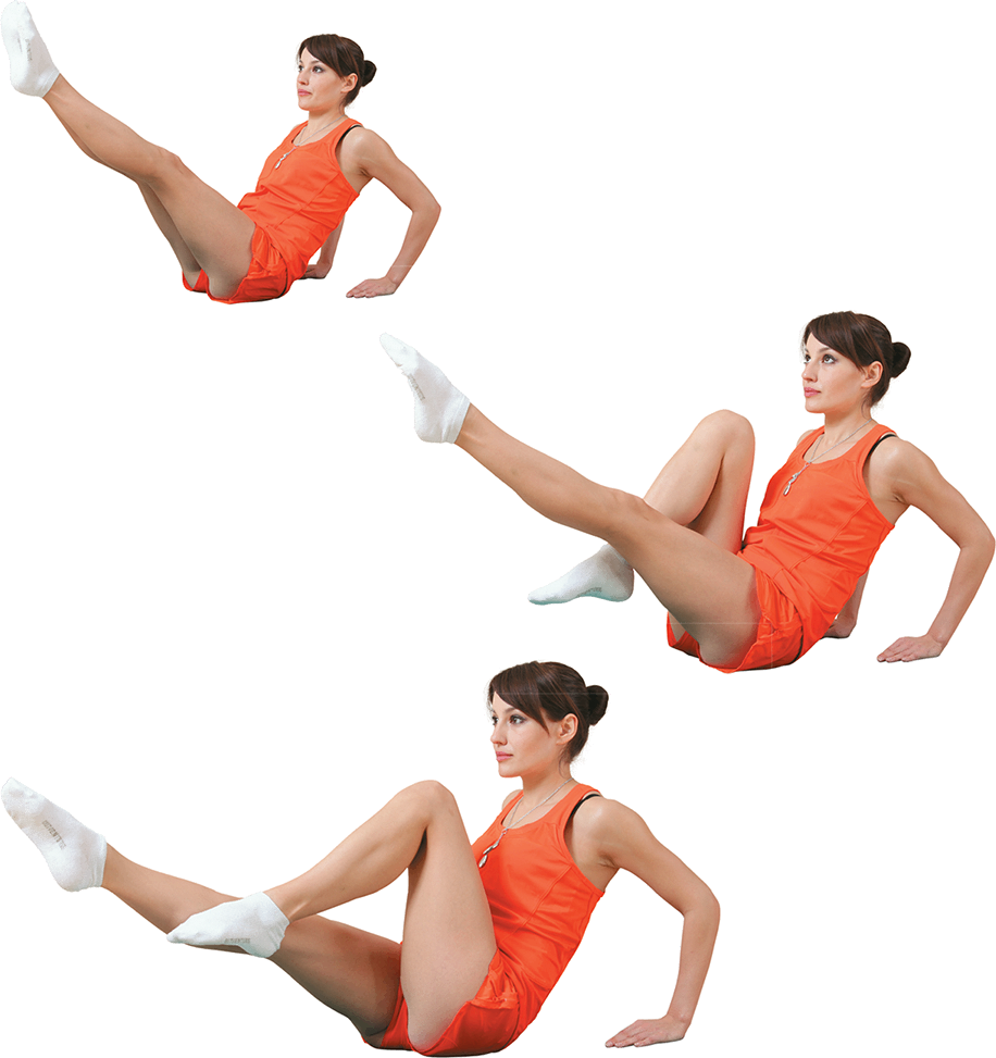 Исходное положение: садимся на пол, ноги вытянуты вперед, ладонями опираемся о пол за спиной.