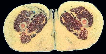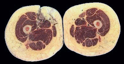 Мышцы на фото – бордовые круги, похожие на стейки, кости – небольшие серенькие кружочки почти по центру, желтая «окантовка» – жир. Как вам?