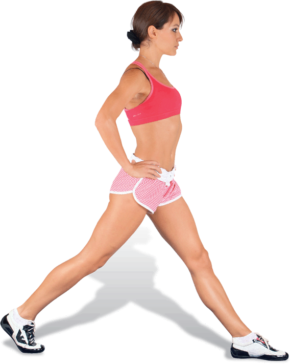 оказалось параллельным полу.Говорят, что бедро задней ноги должно остаться при этом вертикальным, но я это правило не соблюдаю: я шагаю широко, а чем шире шаг, тем сильнее задействована большая ягодичная мышца выставленного вперед бедра и тем сильнее напряжение подвздошно-поясничных мышц и прямой мышцы бедра, оставшегося сзади. Колено должно почти коснуться пола. Не забывайте держать торс и голову прямо. Не заваливайтесь вперед. Вы выполняете упражнение правильно, если колено передней ноги не выходит за проекцию носка.