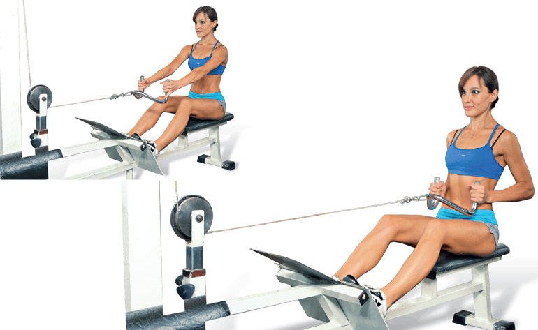 Сядьте так, чтобы ноги были согнуты в коленях под углом 90 градусов и более, а стопы находились под коленями или были заведены еще глубже под колени. Возьмитесь за рукоятку прямым широким хватом, руки и торс при этом образуют широкую букву «Y».