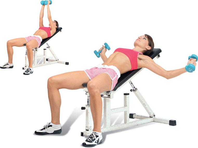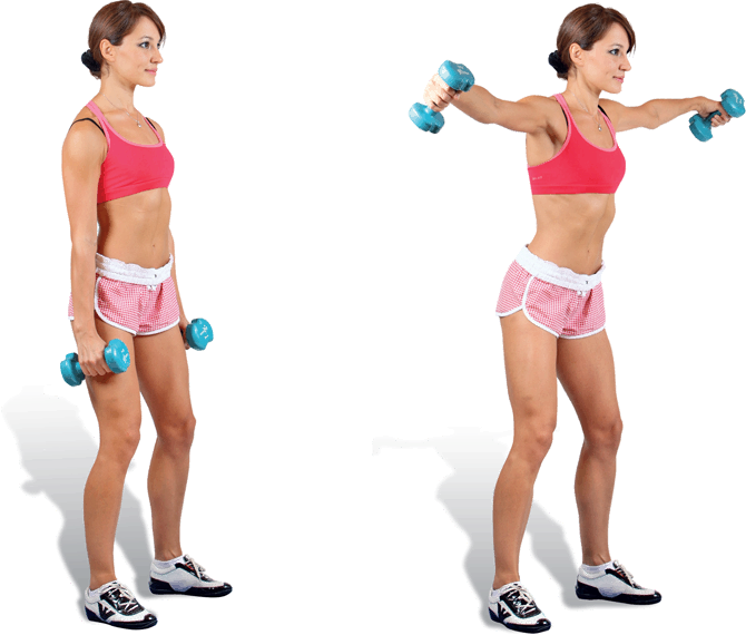 В исходном положении гантели можно держать как перед собой, так и по бокам туловища.На вдохе разведите гантели точно в стороны, верхняя точка амплитуды должна быть чуть выше уровня плеч.