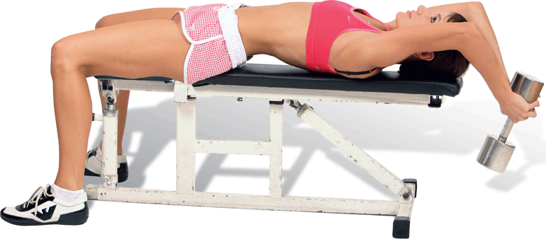 Возьмите в обе руки гантель и лягте на лавку. Ноги поставьте пошире и упритесь ими в пол. Удерживая гантель за один конец, обхватите ее ладонями с одной стороны и большими пальцами с другой. В исходном положении руки должны быть вытянуты прямо над головой.