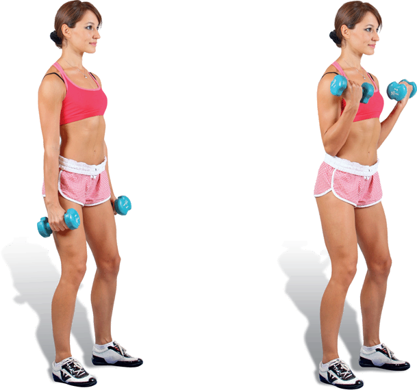 Ладони с гантелями повернуть внутрь к телу. На вдохе согните руки (можно поочередно, можно одновременно), поднимая с разворотом гантели к плечам. Я в целях экономии времени делаю одновременно.