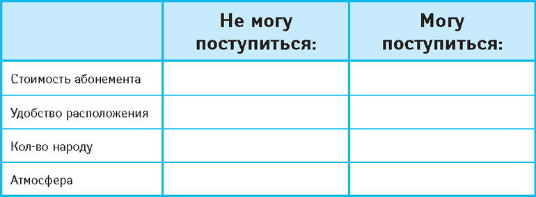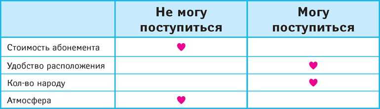 Это значит, что при выборе тренажерного зала мне важна: а) стоимость абонемента, б) атмосфера, а удобством расположения и количеством народа в нем я могу и пренебречь.