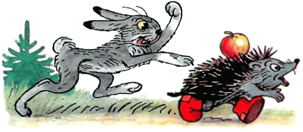Испугался Заяц, потом понял: яблоко упало прямо на Ежа, который, свернувшись клубочком, спал под яблоней. Ёж спросонок вскочил и бросился бежать, а яблоко на колючки нацепилось.