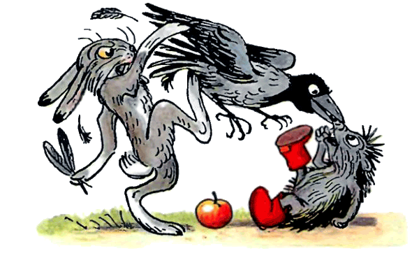 Крик, шум на весь лес. И уже драка начинается: Ворона Ежа в нос клюнула, Ёж Зайца иголками уколол, а Заяц Ворону ногой лягнул…
