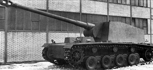 Так что неудивительно, что уже в мае 1941 года на совещании в Бергхофе Гитлер приказал начать разработку самоходных противотанковых установок с мощными пушками калибра 105 и 128 мм и опробовать их против захваченных сильно бронированных французских и английских танков. В качестве базы решили использовать два шасси VK 3001(H). Это были шасси опытного 30-тонного танка. Лобовая броня корпуса составляла 60, а бортовая – 50 мм. В ходовой части использовалась подвеска с шахматным расположением опорных катков и гусеница шириной 520 мм. На машине был установлен двигатель Maybach HL116 мощностью 300 л.с. На базе этого шасси фирма Rheinmetall-Borsig в Дюссельдорфе и изготовила тяжелые САУ 12,8 cm Panzer-Selbstfahrlafette V. 128-мм пушка Gerat 40 с длиной ствола 61 калибр и начальной скоростью снаряда 910 м/с, созданная на базе зенитного орудия, была установлена в открытой сверху рубке в кормовой части корпуса. Для размещения орудия массой 7 т пришлось удлинить ходовую часть, введя восьмой опорный каток. В рубке с толщиной стенок 30 мм размещались пять членов экипажа и 18 пушечных выстрелов. Масса машины достигла 36 т. После уточнения характеристик орудия Управление вооружений пришло к выводу, что при начальной скорости бронебойного снаряда 900 – 920 м/с любой танк является практически не защищенным от стрельбы этой САУ на всех дистанциях действительного огня. Однако, имевшиеся средства наведения позволяли вести эффективный огонь из этого орудия на дистанциях до 1500 м.