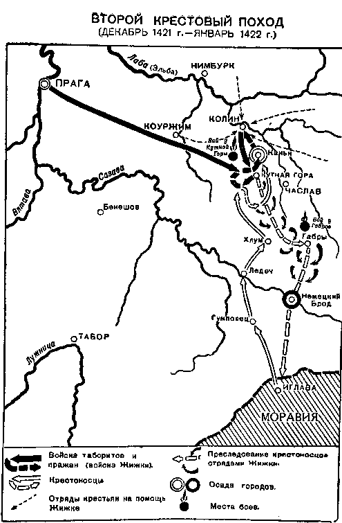 стали постепенно ясны и их врагам. Однако сколько те ни делали попыток подражать военному строю и тактике Табора, их усилия неизменно терпели самую жалкую неудачу: наемники феодалов никогда не были и не могли быть хоть сколько-нибудь равноценными бойцам Табора — неустрашимым воинам этой, по определению Маркса, «национально-чешской крестьянской войны религиозного характера».Табориты вошли в город Кутная Гора 9 декабря. Назавтра к ним присоединились и пражские отряды. Двадцатитысячное войско расположилось здесь лагерем.