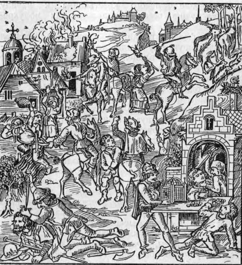 Всей своей тяжестью обрушивались на чешского крестьянина феодальные войны. Грабежи и опустошения, чинимые проходящими войсками, ужасны. Кони вытаптывают хмельники и огороды, чужестранные наемники вырубают плодовые деревья, мнут и сжигают скирды хлеба, подкладывают факелы под соломенные кровли крестьянских хат.