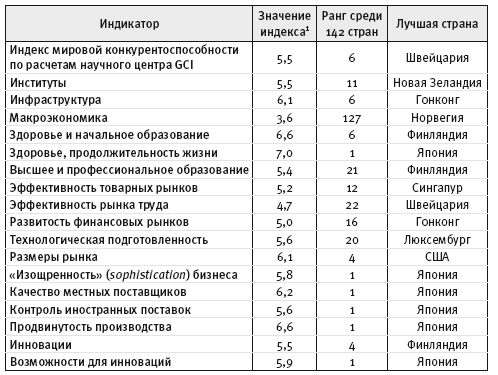 В заключение обратимся к вопросу о международной конкурентоспособности Японии. Данное понятие является чрезвычайно сложным и допускает самые разные толкования. Неудивительно, что существует множество методик и показателей оценки конкурентоспособности. В частности, по данным швейцарского института World Economic Forum, среди 142 исследованных стран мира по индексу конкурентоспособности Япония занимает 10-е место, уступая сравнительно небольшим Швейцарии и Сингапуру, а также нескольким крупным странам, таким как США и Германия (табл. 3.8).