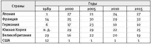 В то же время обратим внимание на позиции, по которым Япония выступает как «страна номер 1». Сюда входят показатели здоровья населения, качества спроса (объемы потребительского рынка, его устойчивость и готовность платить высокую цену за соответствующее качество покупаемых изделий), «изощренность» бизнеса (широкий спектр применяемых в Японии бизнес-моделей, многоотраслевой характер экономики, существование разнообразных типов рынков, совмещение глобального характера операций с ярко выраженными национальными особенностями), а также возможности для инноваций. Перечень позиций, по которым Япония лидирует, характеризует ее как страну, делающую упор на качество, разнообразие и возможности для дальнейшего развития.Динамика международной конкурентоспособности Японии отражена в таблице 3.9. Согласно расчетам швейцарского института IMD по этому показателю в 1989 г. Япония занимала первое место в мире, но в 1990-х годах произошло настолько резкое падение конкурентоспособности, что последствия его не удалось преодолеть ни в 2000-х, ни в 2010-х годах.