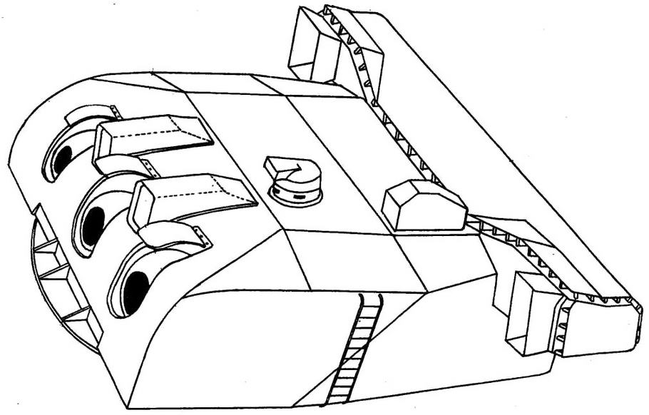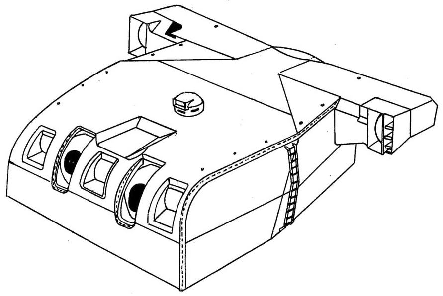 1 - 8-метровый дальномер; 2, 3 - смотровые порты вертикального и горизонтального наводчиков; 4 - командирская башенка с телескопом; 5 - установленные с зазором стальные плиты (термозащита); 6 - учебное прицельное устройство