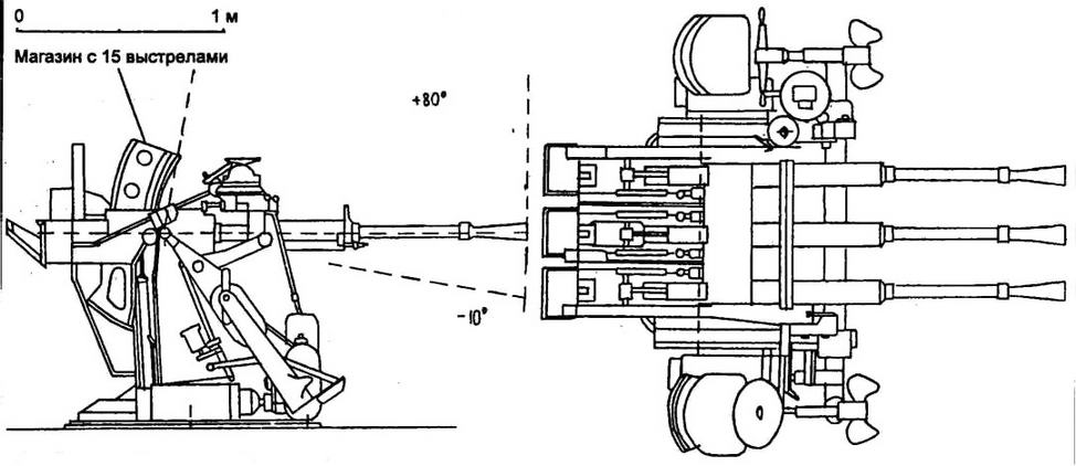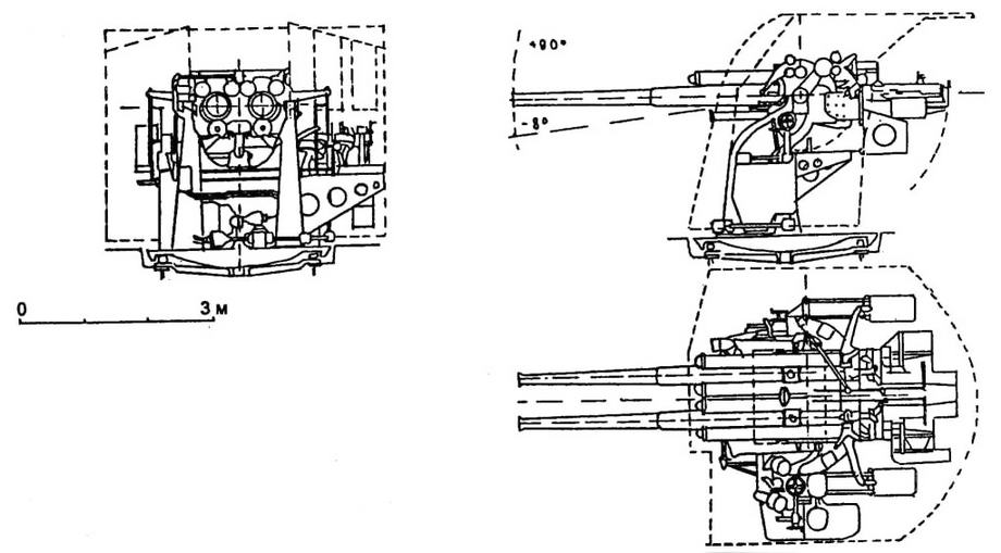 | – спаренная весом 1100 кг (1936 г.) с углом возвышения 80° и снижения 10°; ГН и ВН от электромоторов (1 л.с.) по сигналам от директора со скоростью 18% и 12%; | |