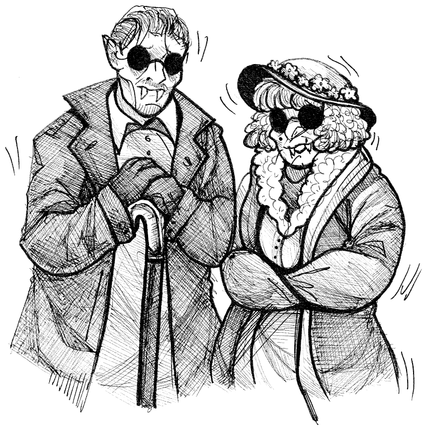 Я вас умоляю, не люди ни на грош, но вполне себе в теме, пока рот не открывают. Обращены ещё до революции семнадцатого года: воспитание имеют, тёмные очки, длиннополые плащи, перчатки и тросточка. Судя по тому, что высунулись днём, явные петербуржцы. Они так и шли за нами, перешёптываясь на ходу: