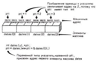 Не знаете, что сказать? В нашей системе единицей адресации является байт, но тип int использует два байта, а тип float– четыре. Что произойдет, если вы скажете: "прибавить единицу к указателю?" Компилятор языка Си добавит единицу памяти. Для массивов это означает, что мы перейдем к адресу следующего элемента, а не следующего байта. Вот почему мы должны специально оговаривать тип объекта, на который ссылается указатель; одного адреса здесь недостаточно, так как машина должна знать, сколько байтов потребуется для запоминания объекта. (Это справедливо также для указателей на скалярные переменные; иными словами, при помощи операции *pt нельзя получить значение.)